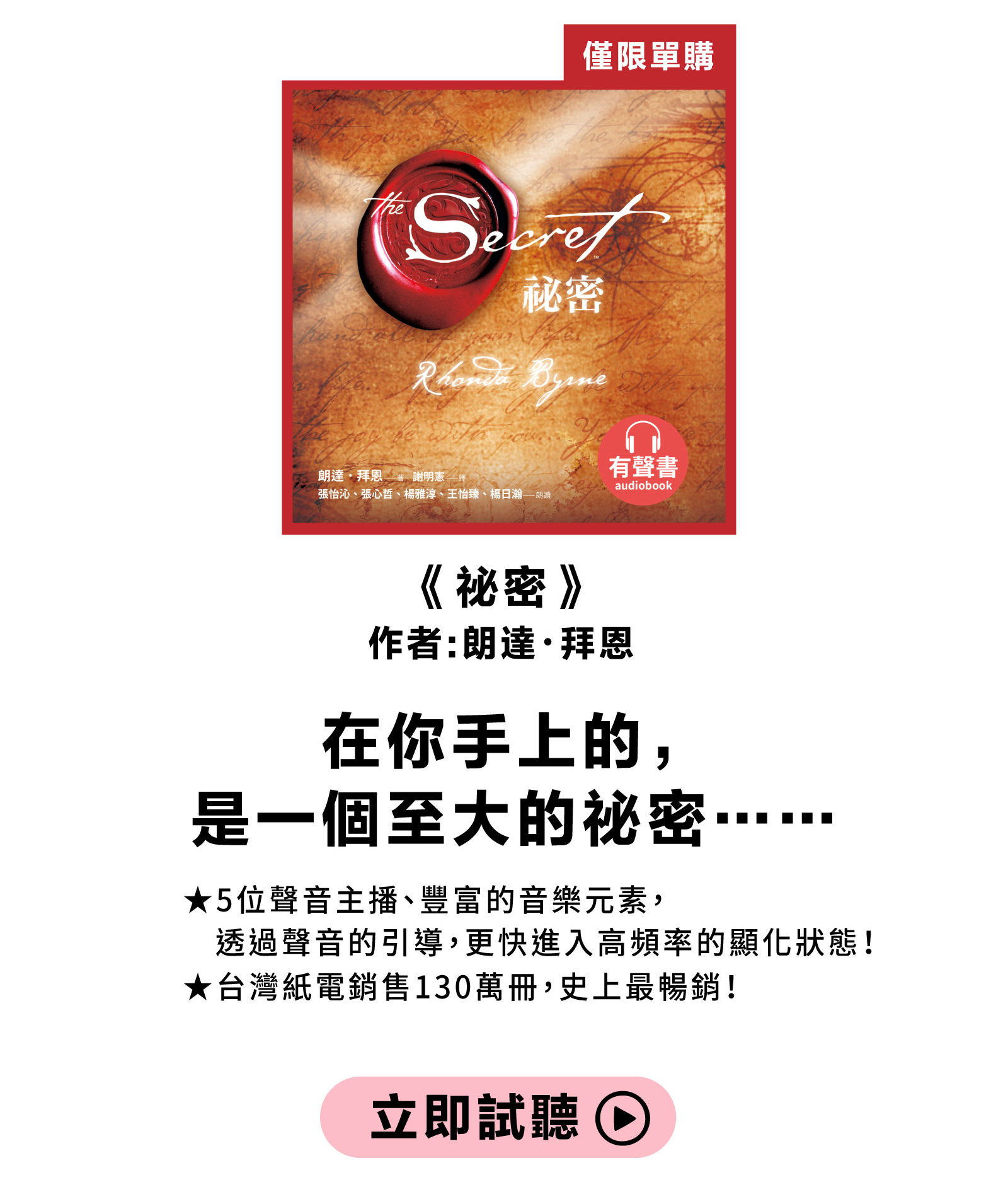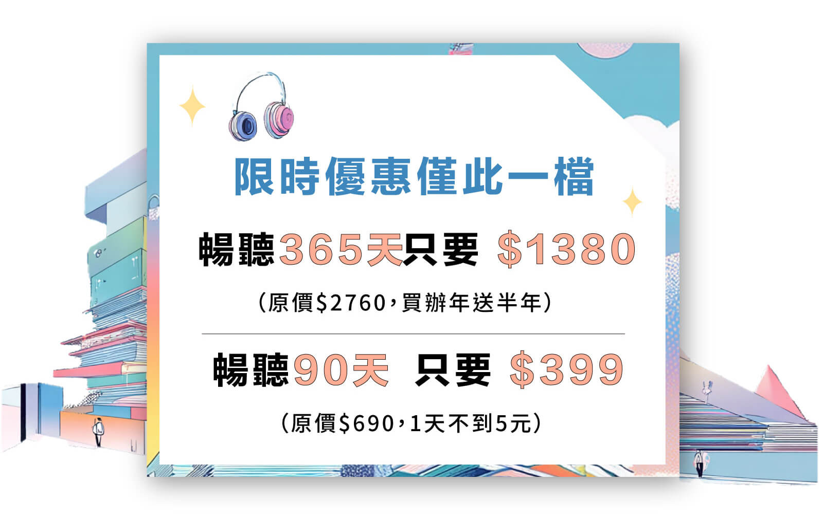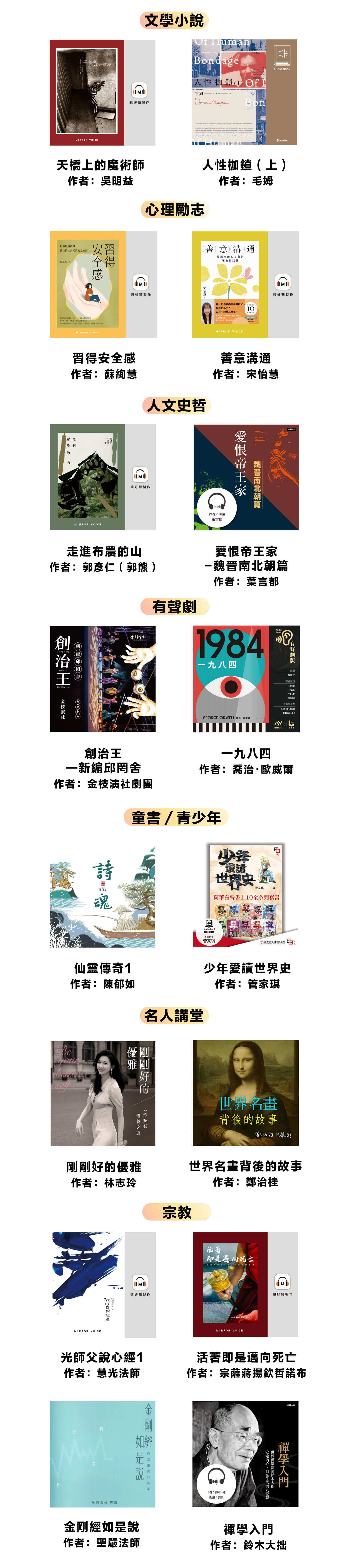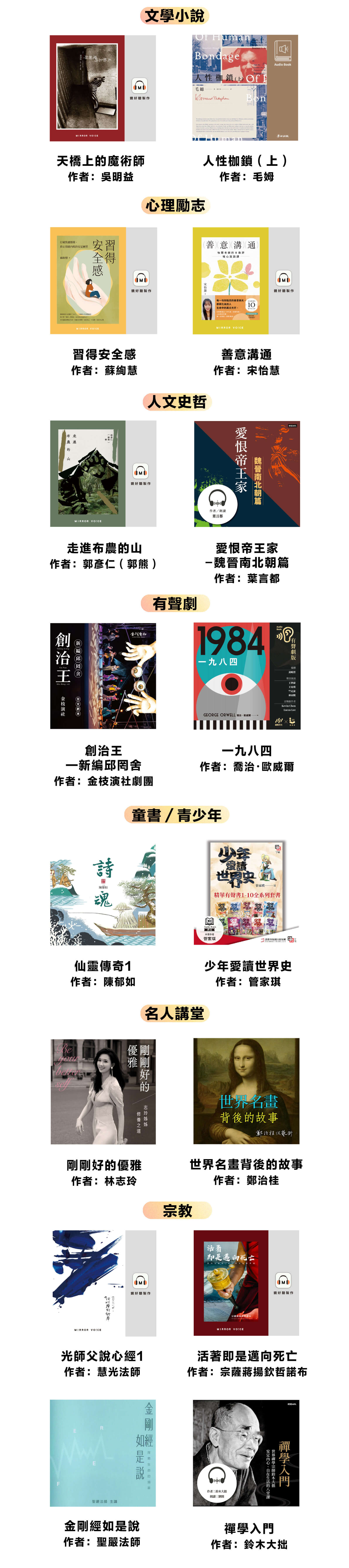 - 升級訂閱會員可聆聽有標示〔訂閱〕之有聲書及Podcast節目;標示〔單購〕之內容因版權限制,須另外付費購買。
